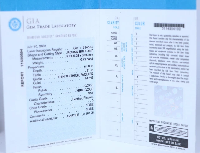 - Inscription laser diamant ” Cartier C116126 ” ” GIA11620894 ” (voir 3ème photo)
