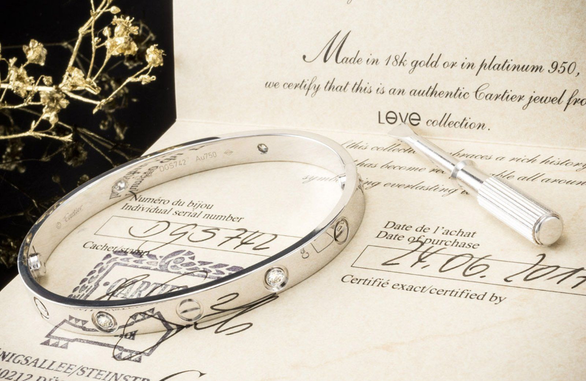 Le bracelet est livré dans la boîte à bijoux Cartier d’origine, y compris le carton extérieur, ainsi que le tournevis correspondant. De plus, une copie partiellement noircie de la preuve d’achat originale et le certificat d’authenticité du fabricant sont joints.