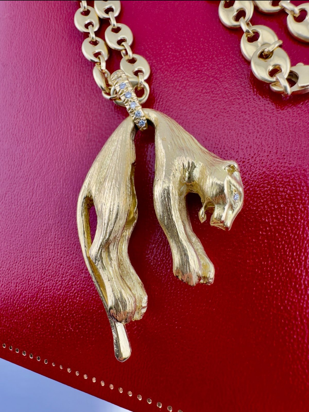 Pendentif chaîne : Panthère détaillée avec yeux et œillets sertis de brillants, tout à fait dans le style de l’emblématique grand pendentif Panther de la série Cartier Panthère