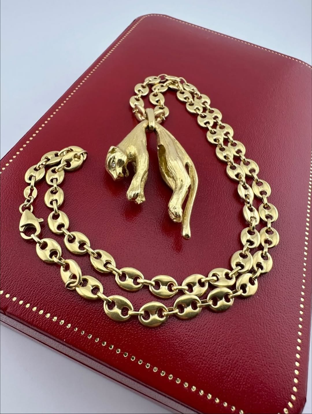 Un ensemble vintage exclusif sous la forme d’un collier de haricots vintage massif (également Gucci Link / Coffee Bean Chain) en or jaune 750 (18K) avec pendentif panthère détaillé assorti avec garniture en diamant fin (yeux et œillet pendentif) dans le style Cartier Panthère.