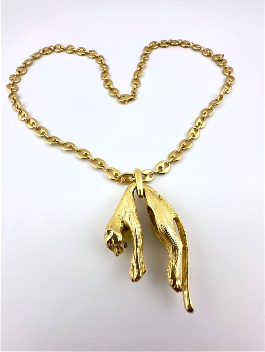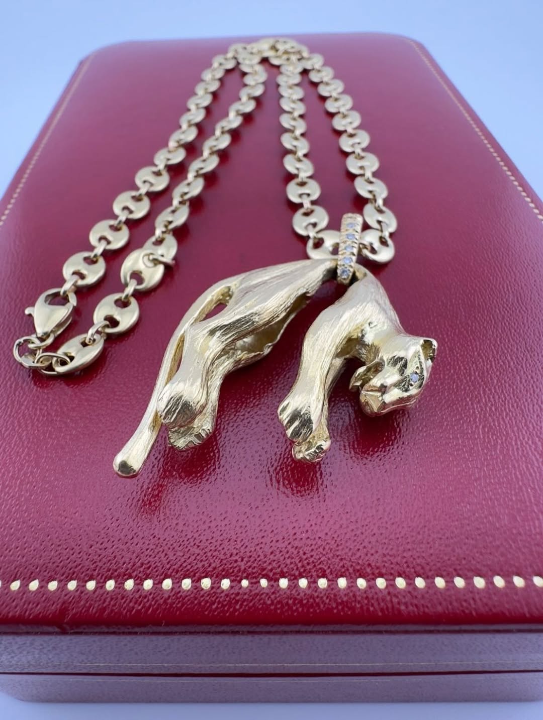 Pendentif chaîne : Panthère détaillée avec yeux et œillets sertis de brillants, tout à fait dans le style de l’emblématique grand pendentif Panther de la série Cartier Panthère