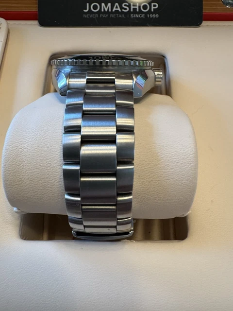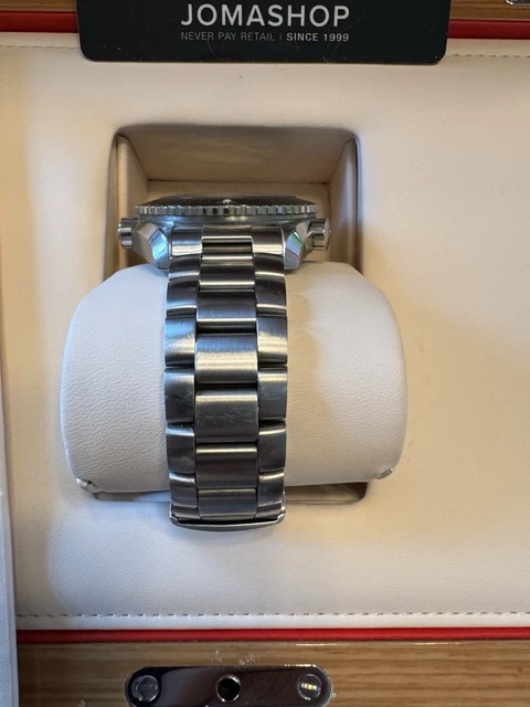 - Caractéristiques : Aiguilles lumineuses, Chronomètre, Indicateur de date, Résistant aux champs magnétiques, Verre saphir, Lunette tournante