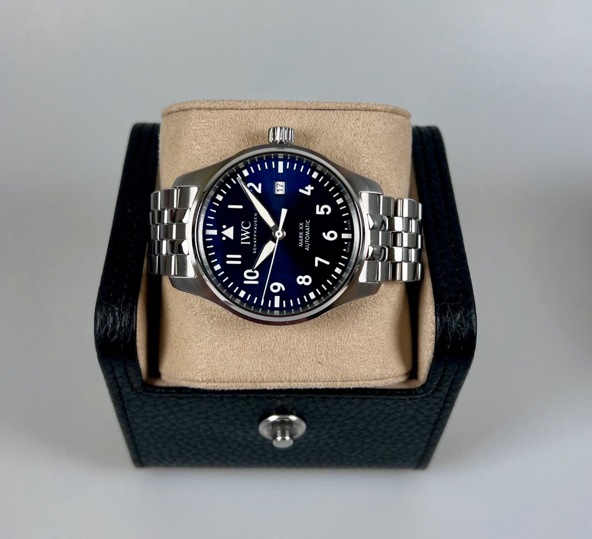 Ici, nous vous proposons un IWC Mark XX, Réf. IW328204, en acier inoxydable. Il s’agit de la variante avec un cadran bleu et un bracelet en acier.