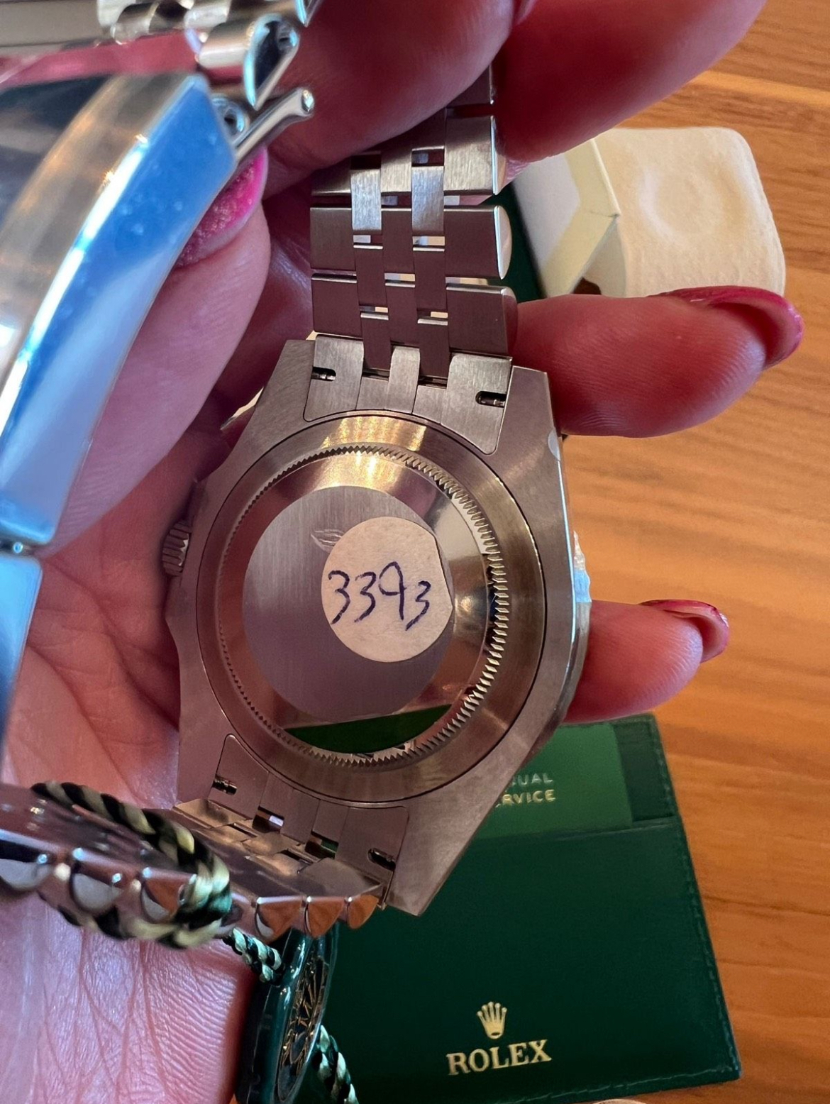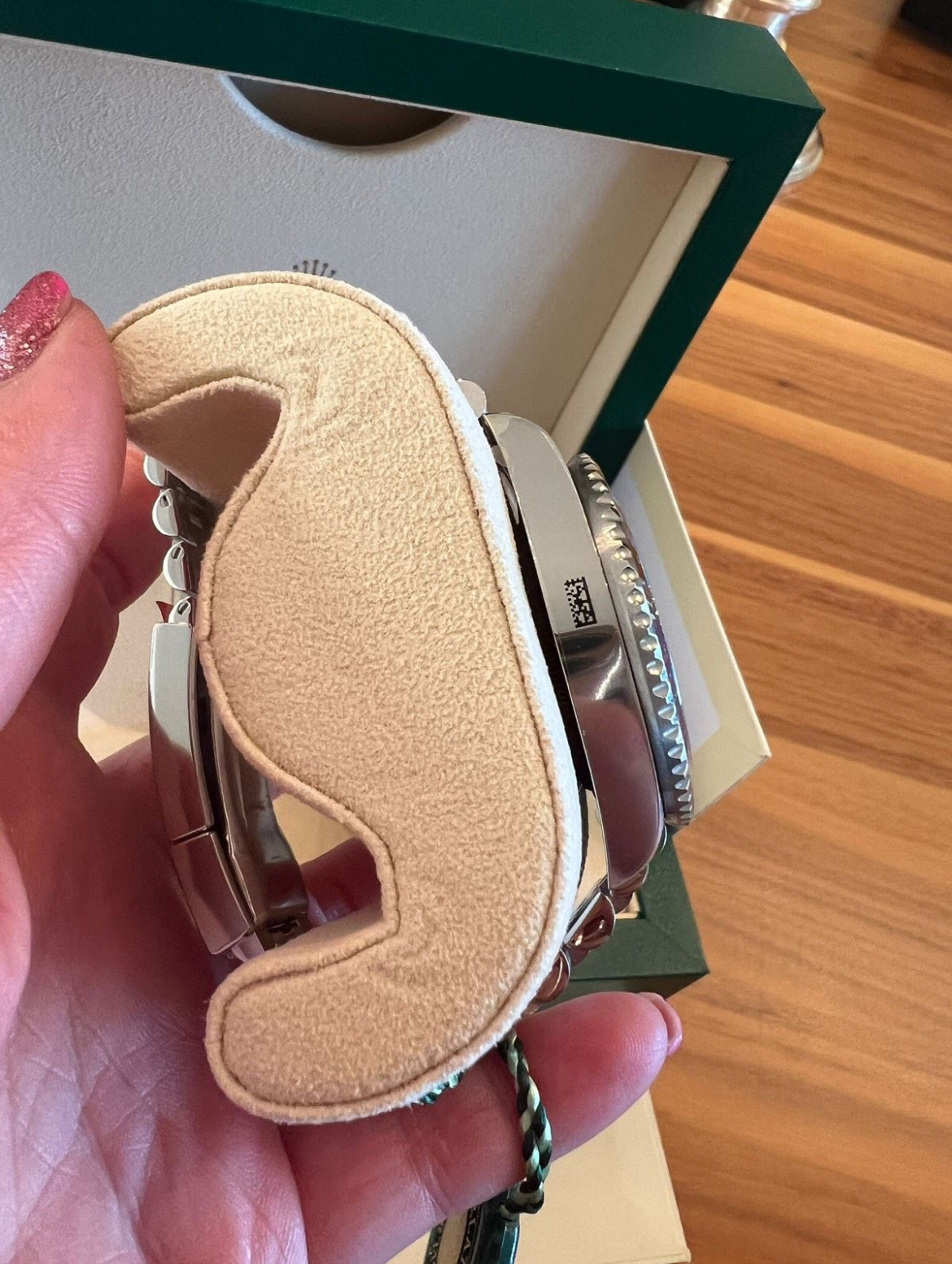 La montre a été achetée en France en juillet 2021. La montre n’a jamais été portée et est encore complètement collée avec les autocollants Rolex d’origine.