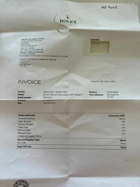 Rolex GMT-Master II « Batman » référence 116710BLNR , dotée de l’emblématique lunette en céramique noire et bleue , d’un boîtier en acier inoxydable de 40 mm et du bracelet Oyster classique. Cette pièce a été révisée en usine par Rolex UK en mars 2025 et est en excellent état, avec justificatifs.