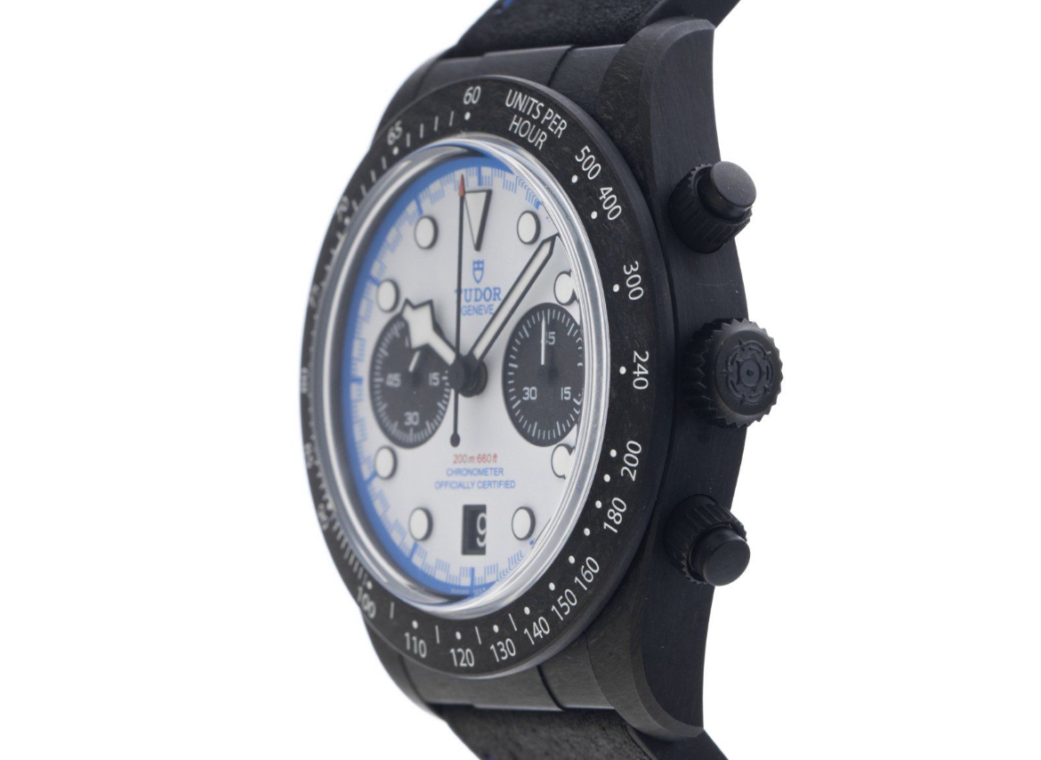 Boîtier carbone noir satiné, diamètre du boîtier sans couronne 42mm, hauteur du boîtier 14,3mm. Lunette carbone avec échelle tachymétrique. Bracelet caoutchouc noir avec couture décorative bleue, largeur de début 22mm, fermoir à goupille carbone avec logo du fabricant. Cadran blanc mat avec index lumineux et aiguilles lumineuses noires. Mouvement automatique, chronographe, chronomètre avec certificat (COSC), calibre Tudor MT5813. Affichage de l’heure et de la minute via des aiguilles du milieu, petite seconde avec arrêt de la seconde pour un réglage de l’heure à la seconde près à 9 heures, affichage de la date avec réglage rapide à 6 heures. Verre saphir résistant aux rayures. Couronne vissable avec logo du fabricant, poussoir chronographe vissable. Fond en acier inoxydable revêtu de PVD, vissé et gravé. Poids de la montre avec bracelet 77g. Numéro de référence: 79377KN-0001, ID: P1296160000725H-12600/7350, Numéro d’article: 10000081707. Boîte Tudor d’origine avec carton extérieur et papiers de garantie de juillet 2025 ainsi que description et extrait du registre de montre de juillet 2025, certificat The Watch Register / sans entrée (base de données internationale pour les montres perdues ou volées), Full Set. Non porté.