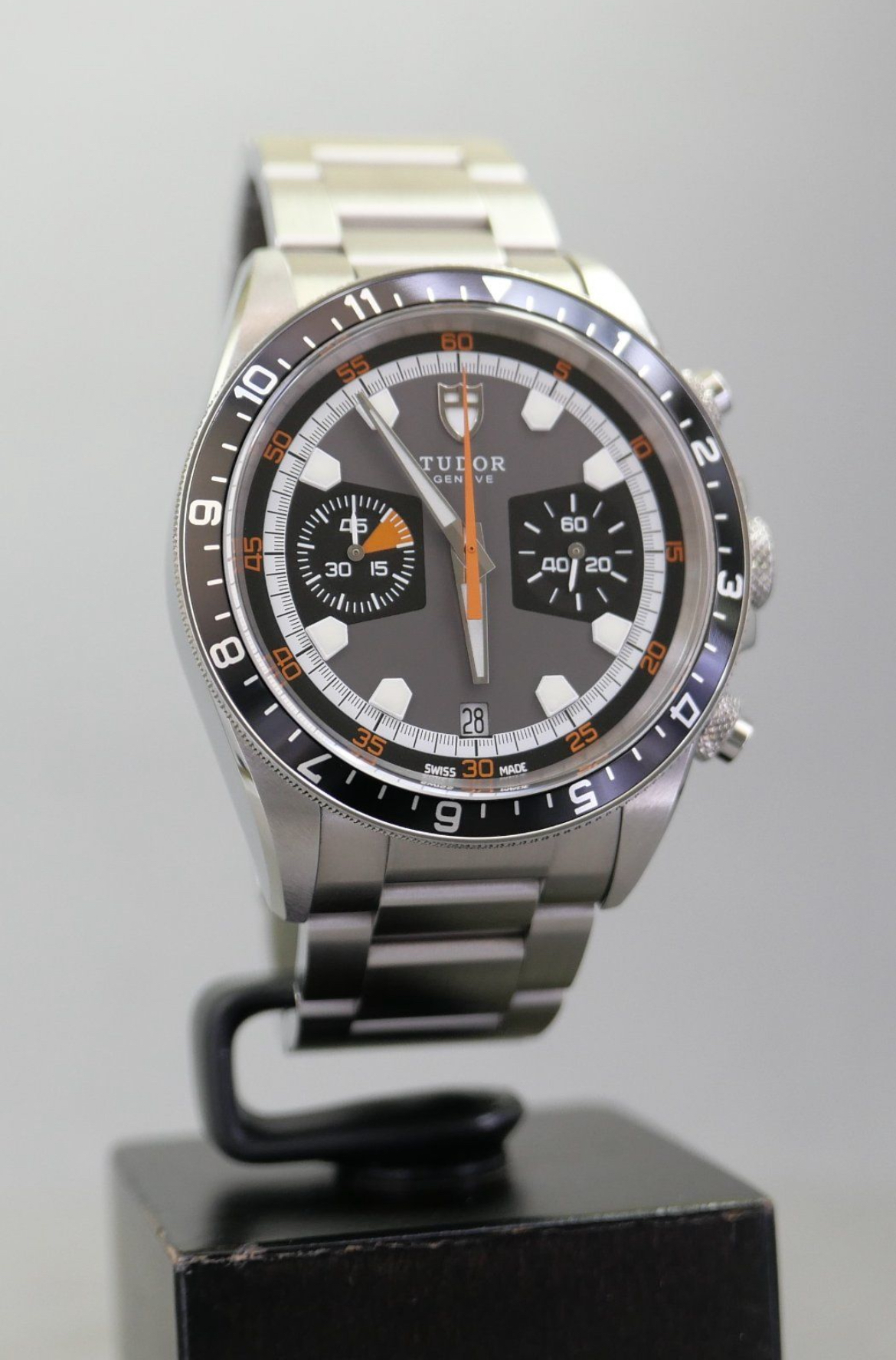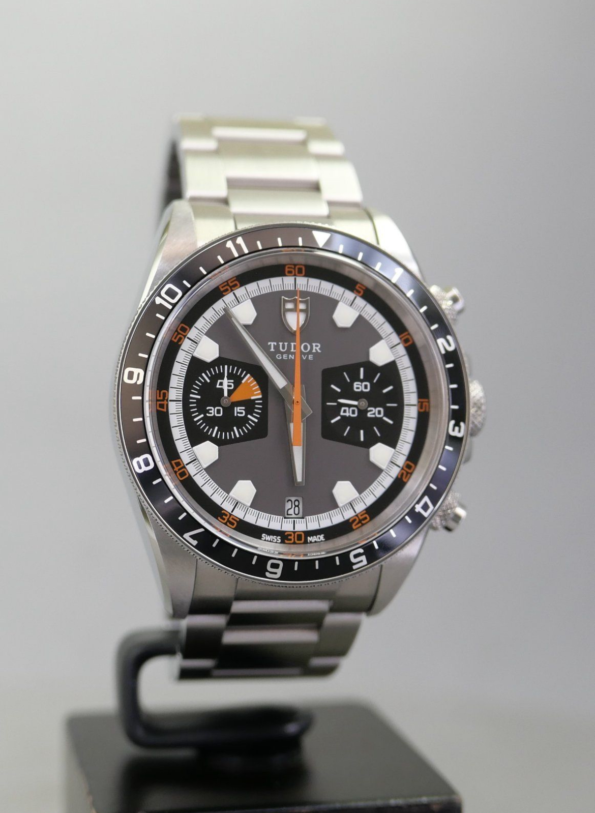 Contenu de la livraison: Tudor Heritage Chrono, boîte d’origine avec carton extérieur, carte de garantie d’origine, mode d’emploi, 2 maillons séparés, étiquette de suspension, sac de riz, sangle Tudor Nato d’origine, certificat d’authenticité.